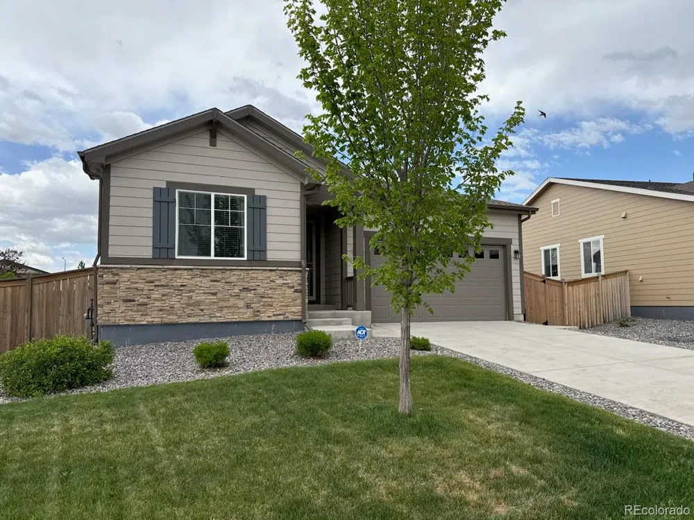 BUYERS GOT COLD FEET! Welcome to this beautifully maintained ranch-style home, ideally located in the highly desirable Sky Ranch community. Inside, the sunlit main level is filled with natural light from expansive windows. Elegant LVP flooring flows through the open-concept living and dining areas, creating a seamless transition into the kitchen—perfect for both everyday living and entertaining. The kitchen is a chef’s dream, featuring stainless steel appliances, stunning granite countertops, a stylish tile backsplash, and a large island with built-in outlets—ideal for casual dining or meal prep. Abundant wood cabinetry with crown molding, recessed and pendant lighting, and a generous walk-in pantry complete this impressive space. A versatile home office offers flexibility and can easily serve as a playroom or quiet study area. The primary suite is a peaceful retreat, featuring a spacious walk-in closet and a luxurious ensuite bath with dual sinks. Two additional bedrooms share a full hall bath, offering comfort and convenience for family or guests. Step outside to your private backyard oasis with no rear neighbors. Enjoy both covered and open patio areas—perfect for morning coffee and taking in a breathtaking Colorado sunrise. The beautifully landscaped yard includes vibrant flower beds, raised garden beds, and a Tuff Shed for additional storage. A 4-zone sprinkler system ensures easy maintenance year-round. New Class IV roof shingles were installed in 2024! Located close to parks, playgrounds, major highways, DIA, Southlands Mall, shopping, dining, and entertainment, this home offers the perfect blend of comfort, style, and community.